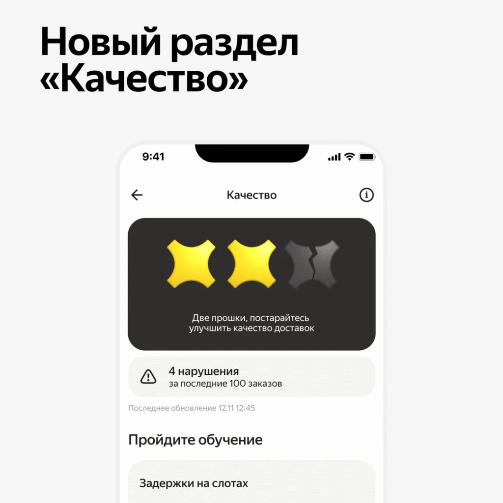 Чтобы поддерживать высокое качество доставок, обязательно нужно знать и соблюдать стандарты сервиса. Раз в неделю мы присылаем всем курьерам отчет по качеству выполнения заказов: в него постепенно добавляются данные по соблюдению всех стандартов — были нарушения или нет, количество инцидентов. Это поможет вам всегда знать, все ли в порядке с доставками, и понимать, что конкретно нужно подтянуть, чтобы сохранить доступ к заказам и свой доход.
