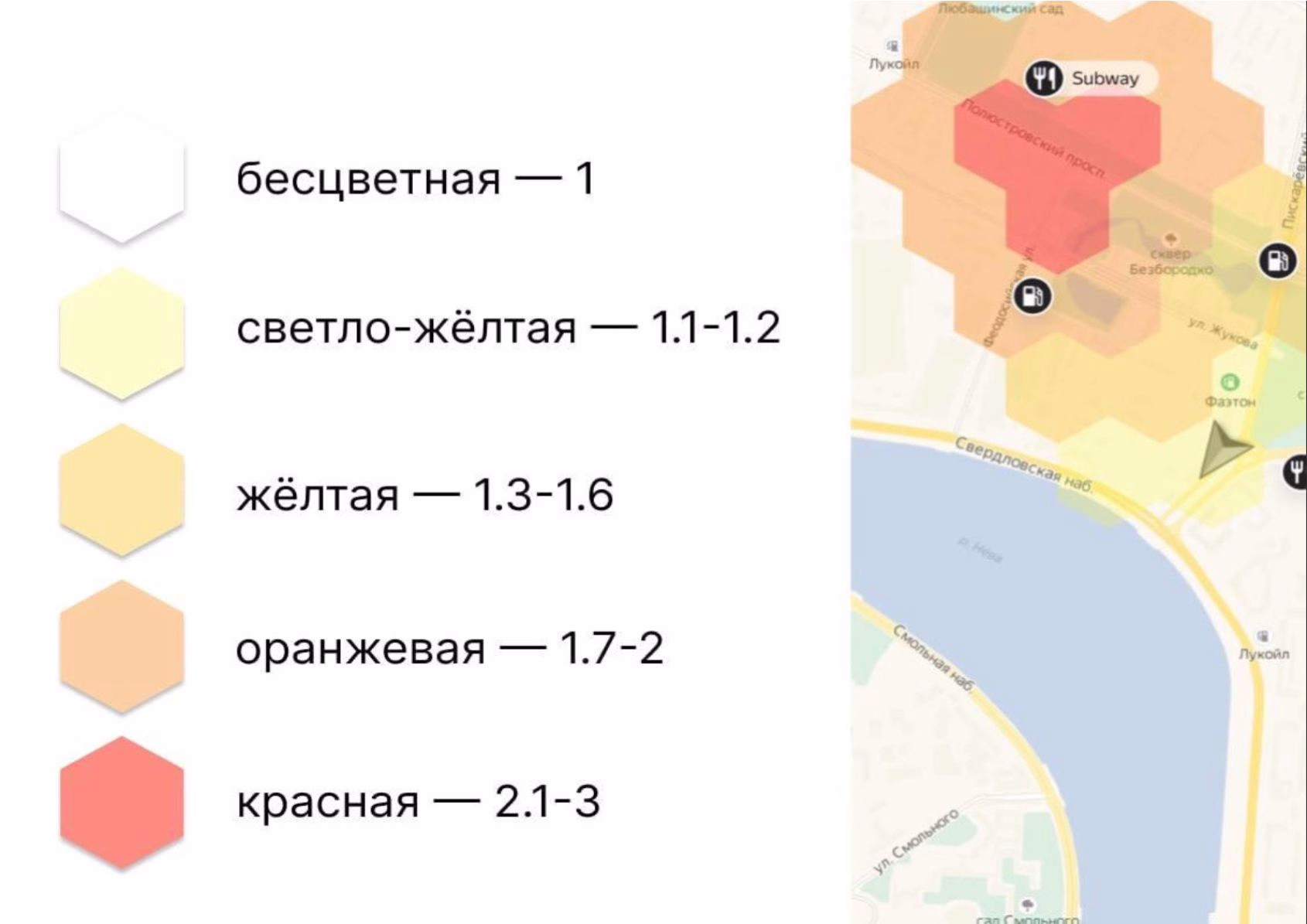 • В каждой зоне есть коэффициент спроса — на него умножаем плату за маршрут. Зависит от количества заказов на локации и варьируется от 1 до 3 (без учёта дополнительного коэффициента).